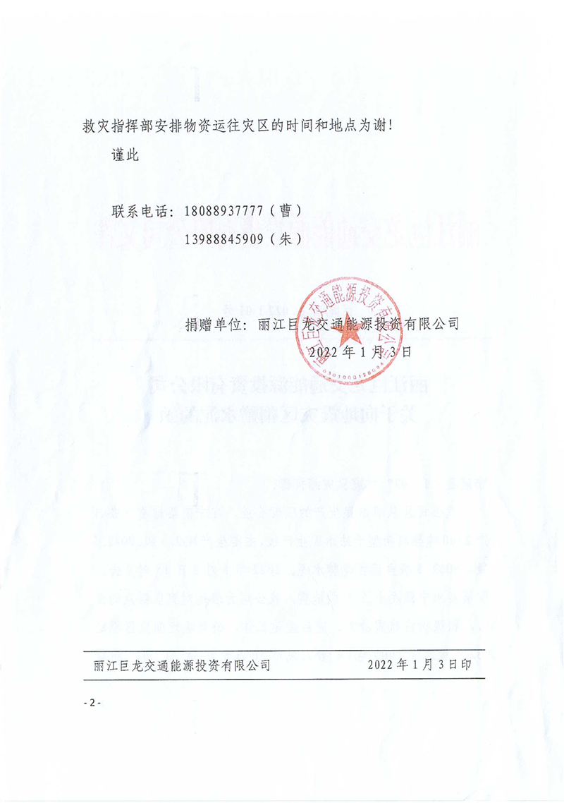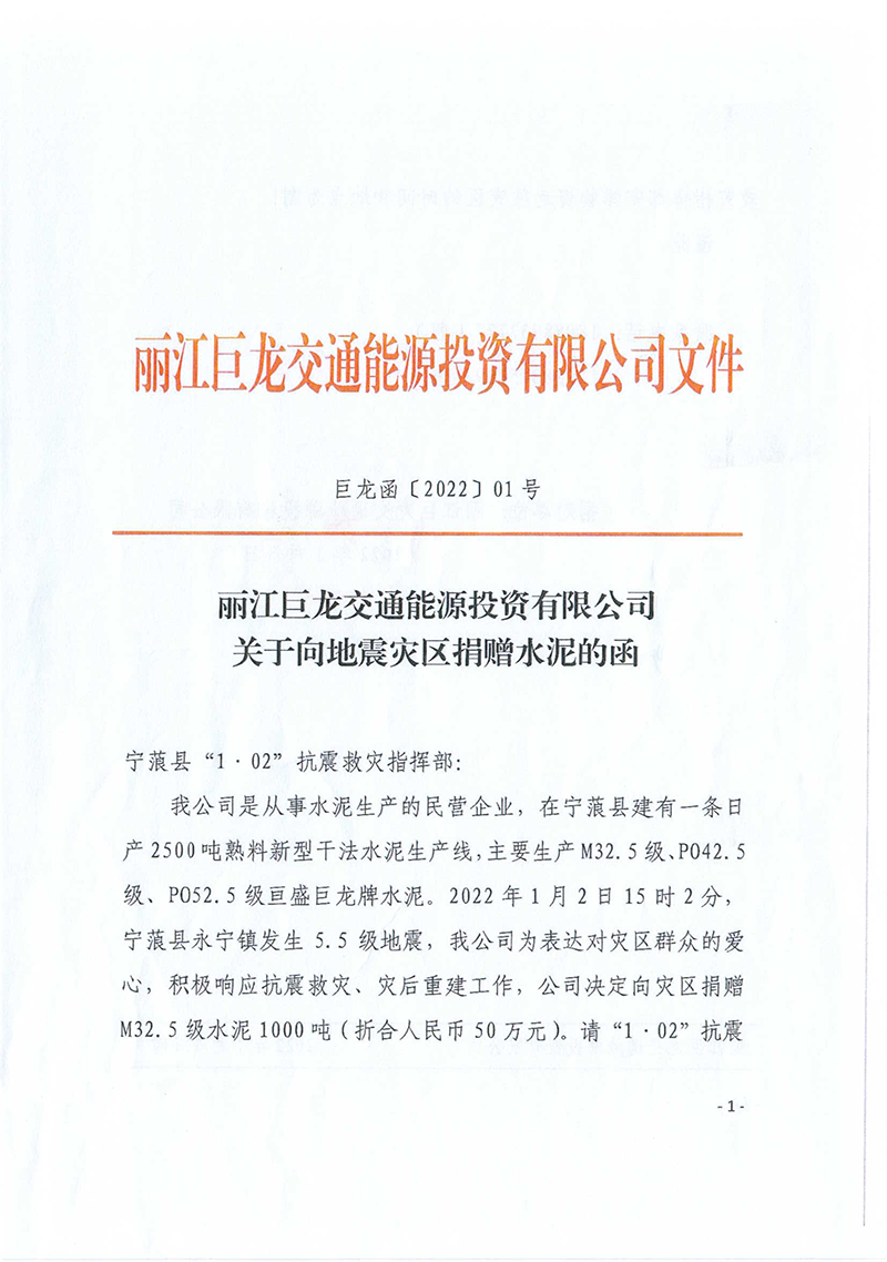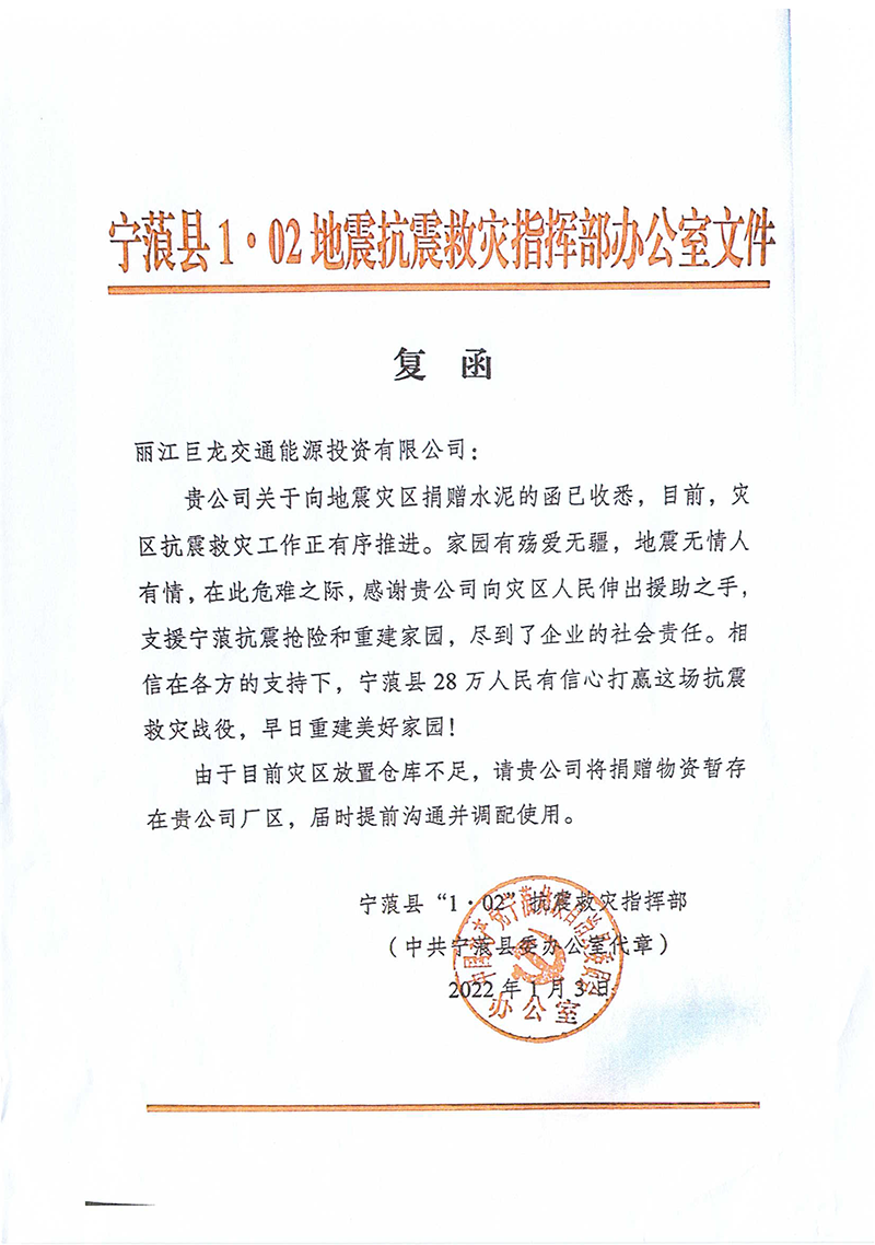 2022年1月2日15時2分寧痕縣永寧鎮(zhèn)發(fā)生5.5級地震,我公司為表達對災區(qū)群眾的愛心,積極響應抗震救災、災后重建工作,公司決定向災區(qū)捐贈M32.5級水泥1000噸(折合人民幣50萬元)。